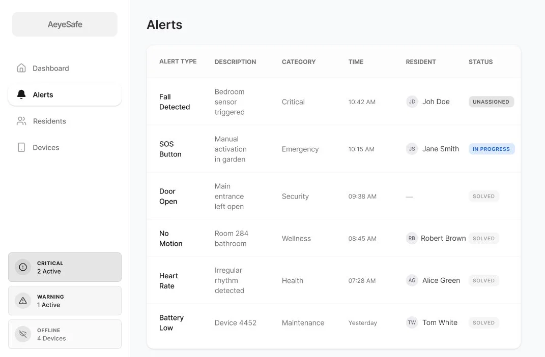 I started with a centralized alert page to give caregivers a single place to see everything happening across the facility.